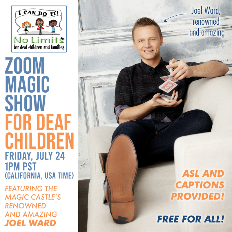 Please join us for this exciting REMOTE event on Friday, July 24th at 1pm PST (California, USA time). The incredible and hilarious magician Joel Ward will be joining us for his second magic show of the summer. The first show was a huge hit, with deaf children and families joining in from all over the world!