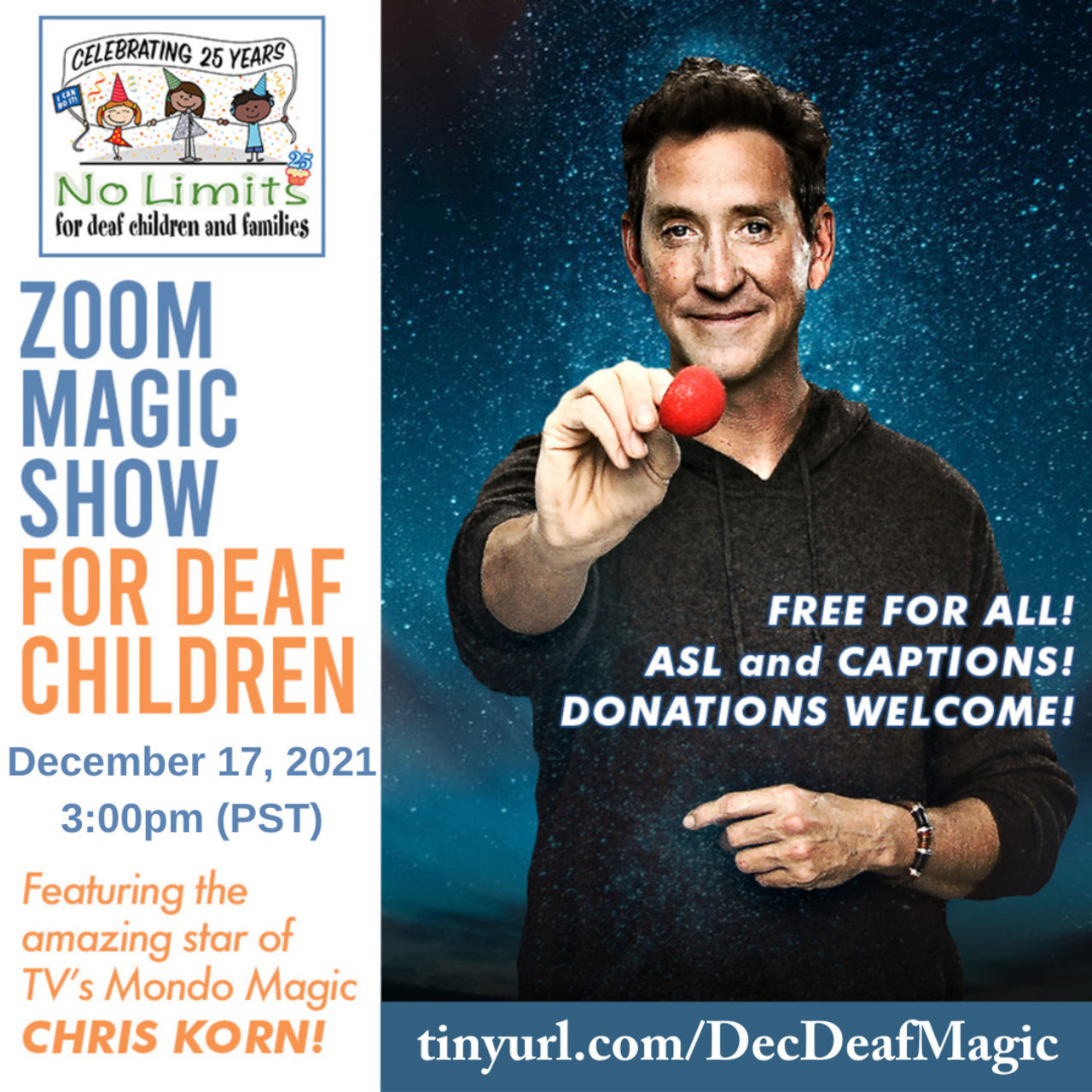 We are so excited to host Master of Illusion Chris Korn, star of Mondo Magic on A&E and The Magicians on the BBC, for this free, remote Magic Show that will delight and amaze deaf children of all ages!The Zoom event is on on Friday, December 17 at 3PM PST (California, USA time).Register on this page to get the Zoom link. Please make sure to check your spam folder if you don't see an email.You won't want to miss it!